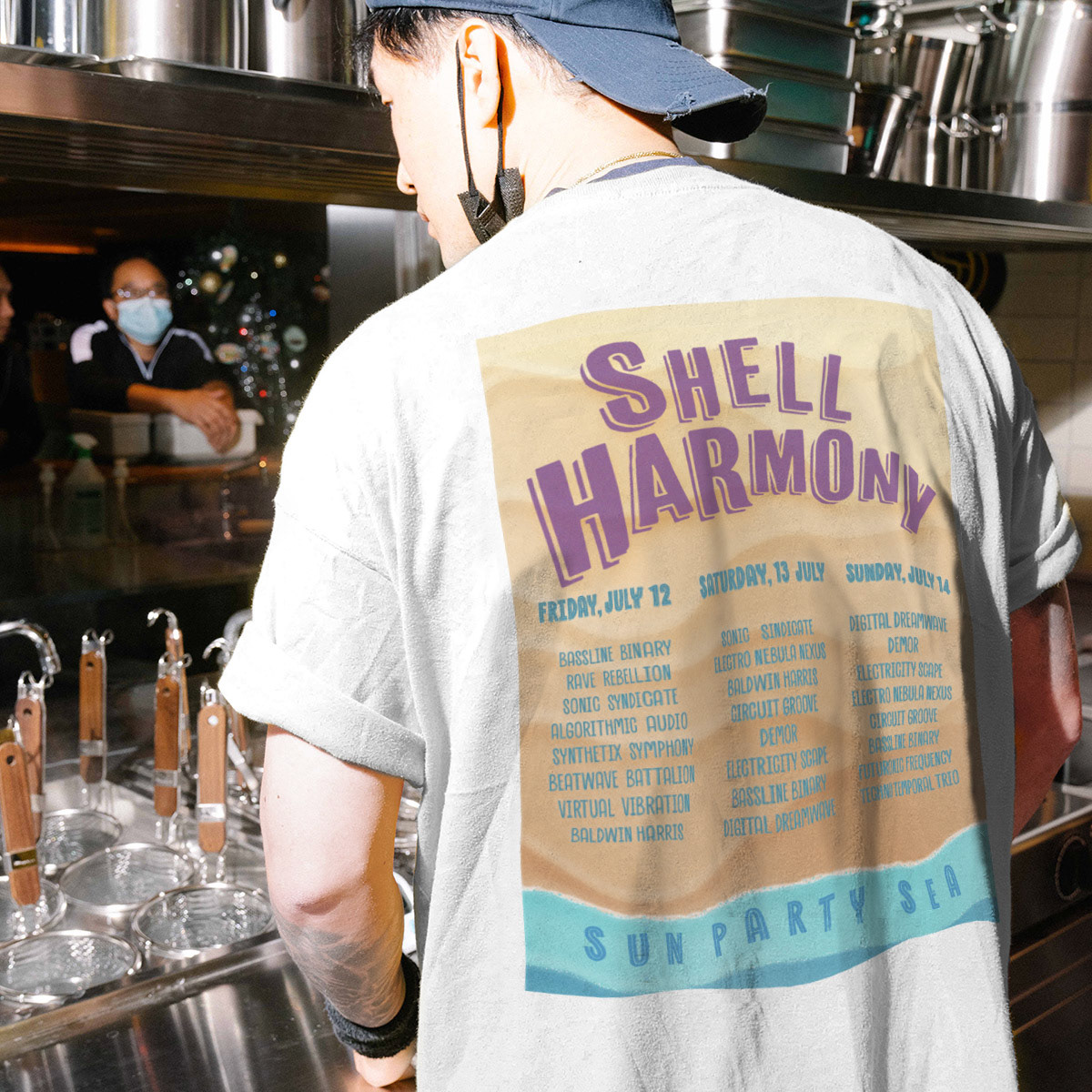 strong typography and a beach inspired color palette. I also created a custom festival T shirt featuring